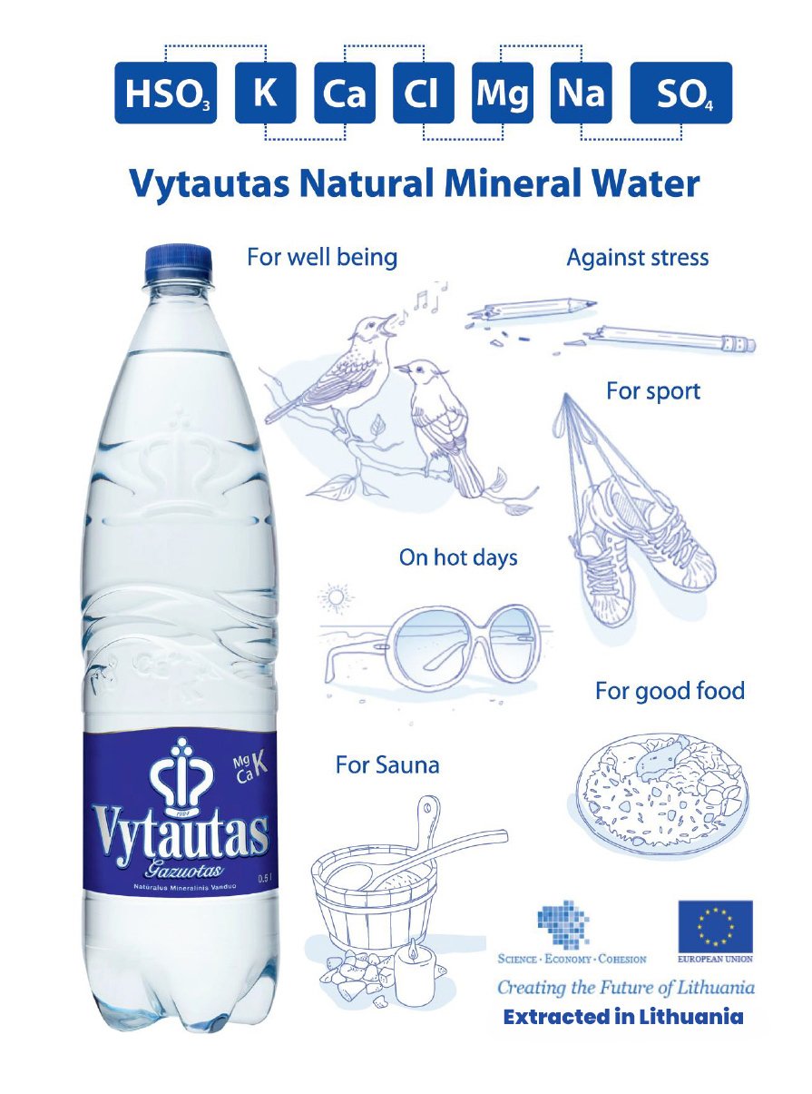 Vytautas (sparkling) contains the highest amount of essential mineral (i.e. calcium, magnesium, potassium, etc.) among all the natural mineral waters in the Baltic States. Total amount of dissolved solids 7309 mg/l.